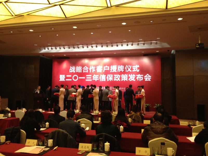 1月17日下午,中信保寧波公司戰略合作客戶授牌儀式暨2013年信保政策發布會在南苑環球酒店舉行,市政府各有關部門、各區縣外經貿主管部門以及50家中信保寧波2012年戰略合作大客戶代表出席,我司應邀參加授牌儀式。