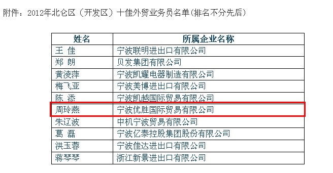 賽爾網訊 近日,北侖區經濟發展局公布“2012年北侖區十佳外貿業務員名單”,周玲燕作為優景進出口外銷團隊的代表,成功入圍。