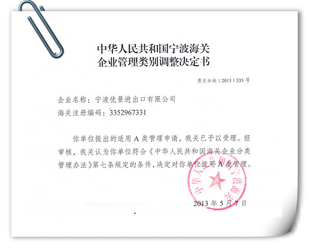 優景進出口公司至2012年成立以來,其業績穩步向上,企業內部管理規范,海關查驗率和查獲率都較低。根據海關總署對企業管理要求,優景進出口符合已適用B類管理一年以上;連續一無走私罪、走私行為、違反海關監管規定的行為;連續一年未因進出口侵犯知識產權貨物而被海關行政處罰;上一年度進出口總值50萬美元以上;上一年度進出口報關差錯率5%以下等各項要求,順利申請成為A類管理企業。而A類管理企業將享受到海關對其提供的各種通關便利政策。優景進出口順利申請A類管理企業,不僅標志著優景進出口上升到一個新的臺階,也將帶動集團整體內部管理力和外部競爭力的提升,對我集團的長遠發展具有重要意義。