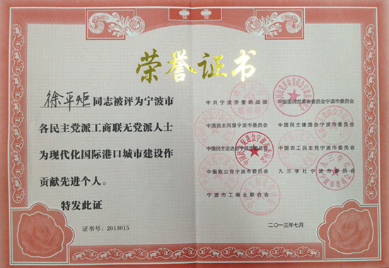 徐平炬董事長作為民建市委會委員、民建企業(yè)家協(xié)會常務(wù)副會長,與其他50人共同榮獲“寧波市各民主黨派工商聯(lián)無黨派人士為現(xiàn)代化國際港口城市建設(shè)作貢獻(xiàn)”先進(jìn)個人稱號,并接受了大會表彰。近年來,徐平炬董事長帶領(lǐng)賽爾集團(tuán)不懈努力,為寧波港口城市建設(shè)做出了重要貢獻(xiàn):