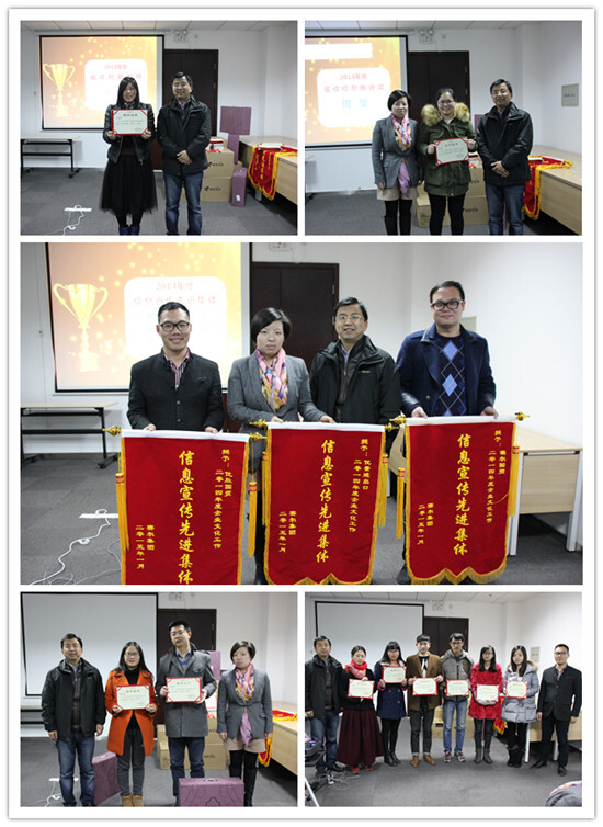 田園首先匯報集團2014年度文化宣傳工作,介紹了季刊、中英文月報、周報、網(wǎng)站、微信等集團自媒體發(fā)展情況、編委構(gòu)成、年度業(yè)績,公布了各部門、子公司以及通訊員2014年度來稿數(shù)量、積分和獲獎情況。2014年,編輯部共收到各類稿件1067篇,比上年增長178%。賽爾國貿(mào)、優(yōu)景進(jìn)出口、優(yōu)勝國貿(mào)投稿量位列集團前三,榮獲“信息宣傳先進(jìn)集體獎”;周維維、王依偉等5人榮獲“最佳通訊員獎”,吳雅楠、胡躍東等10人榮獲“優(yōu)秀通訊員獎”,周瑩獲得“最佳信息推送獎”,盧堂翠榮獲“最佳欄目編輯獎”。