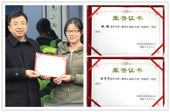 會議最后,為表彰張雯雯和姚暢兩位社員在集團外語培訓上所作出的貢獻,特向她們頒發了“金橋獎”榮譽證書,今后,“金橋獎”將成為表彰翻譯社內有突出貢獻社員的常設榮譽獎項。
