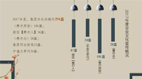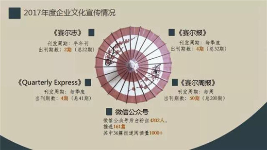 徐總對2017年集團(tuán)企業(yè)文化宣傳工作成績給予充分肯定(鼓掌),他強(qiáng)調(diào),要做好企業(yè)文化宣傳工作,核心基礎(chǔ)是做好企業(yè)文化建設(shè)工作,只講業(yè)務(wù)發(fā)展不講文化建設(shè)的企業(yè)是干燥、無趣、沒有活力的,企業(yè)文化也是生產(chǎn)力,企業(yè)規(guī)模越大越要重視企業(yè)文化建設(shè)。企業(yè)文化建設(shè)重在內(nèi)涵提升,它能培養(yǎng)并反映出一個(gè)優(yōu)秀企業(yè)的良好氣質(zhì),要通過創(chuàng)新性的、體現(xiàn)良好趣味的企業(yè)文化平臺載體和活動(dòng)策劃,深度挖掘、提煉有價(jià)值的文化內(nèi)容,輔之以生動(dòng)的文化宣傳,吸引賽爾伙伴們參與其中,感受樂趣,增強(qiáng)歸屬感。希望賽爾伙伴們在專心做好業(yè)務(wù)的同時(shí),也積極參與企業(yè)文化各項(xiàng)活動(dòng),讓賽爾成為有獨(dú)特文化魅力和活力的有機(jī)企業(yè)。
