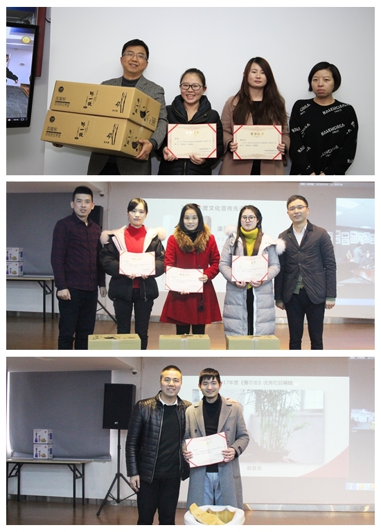好啦,自夸收一收,更多的是感謝。過去的一年,企業(yè)文化工作得到了領(lǐng)導(dǎo)和小伙伴們的鼎力相助,感謝優(yōu)訊進(jìn)出口、優(yōu)越進(jìn)出口、優(yōu)勝國貿(mào)三家公司的小伙伴,你們超棒噠,總計(jì)近百篇的超高投稿量幾乎要承包企業(yè)文化一半的稿件了哦,雙手奉上“企業(yè)文化宣傳先進(jìn)單位獎(jiǎng)”。感謝優(yōu)訊吳雅楠、綜合行政曹瀟艷等五位小伙伴出色的宣傳表現(xiàn),“企業(yè)文化宣傳先進(jìn)個(gè)人獎(jiǎng)”非你們莫屬,哎呀加油,爭取明年突破個(gè)人最高投稿記錄。也感謝《賽爾志》年度優(yōu)秀欄目編輯和15位年度優(yōu)秀通訊員,真是又有才華又養(yǎng)眼。2018年,一群集才華與顏值于一身的優(yōu)秀通訊員寶寶也即將上線:史圓、葉陳冬、童歡等20人成為集團(tuán)各職能部門和各子公司2017年度信息員;王鴻雁、陳麗麗等4人組成了《賽爾志》新一年的編輯團(tuán)隊(duì)。新的團(tuán)隊(duì)賦予企業(yè)文化新生力量,2018年,是充滿期待和斗志的一年!