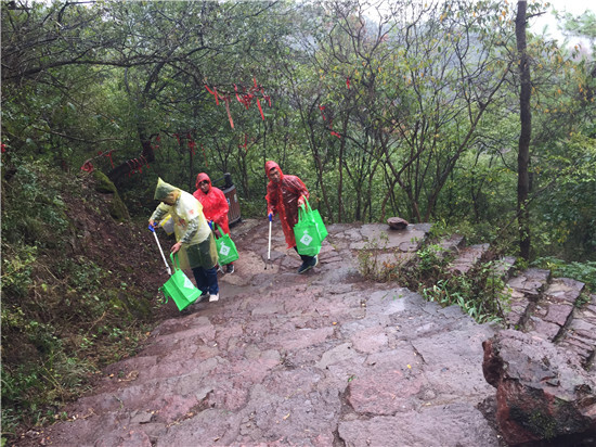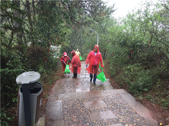 天公不作美,密集的雨點(diǎn)從四面八方打來,卻絲毫沒有影響大家的興致,抵達(dá)終點(diǎn)后,大家各自拿好夾子和垃圾袋,穿好雨衣,一切就緒后,就開始行動(dòng)啦。因?yàn)橄掠辏蠹一ハ鄮兔ΓL(fēng)雨無阻,不放過任何一個(gè)死角,撿拾一路上的各種垃圾。隨行隊(duì)伍中,一位供應(yīng)商朋友帶了自己的小孩來參加此次公益活動(dòng),要給小孩從小樹立保護(hù)環(huán)境,不亂扔垃圾的好習(xí)慣。到達(dá)半山腰的時(shí)候,大家休息了一會(huì),等待后面的伙伴們一同前行。在大家的歡聲笑語(yǔ)中,很快就到達(dá)了山頂,山頂云霧繚繞,下雨后空氣也變得格外清新。