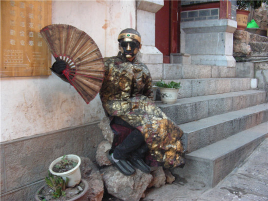 這其實(shí)是真人,打他身邊走過(guò),會(huì)猛地一下打開(kāi)折扇嚇你一跳