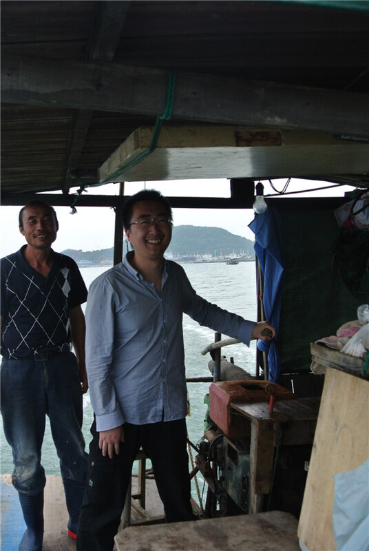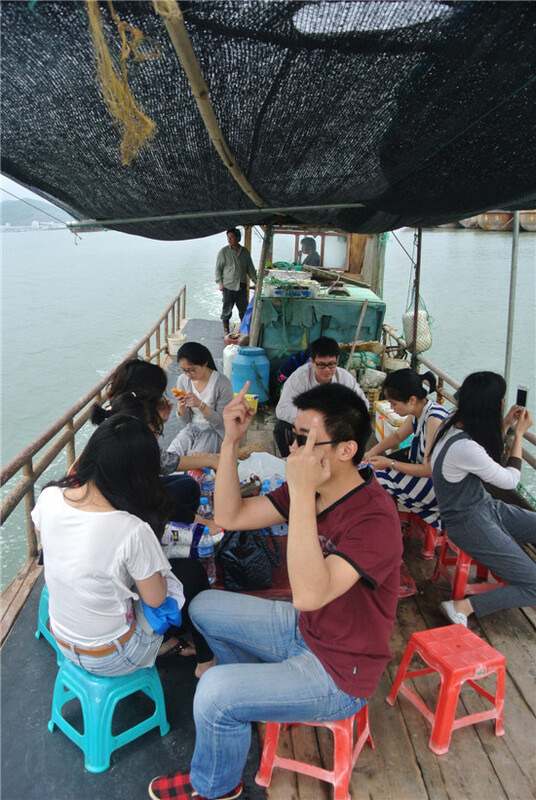 待我們上了稍帶殘舊古色的漁船,漁夫早已撒網下去。我想,這該謂之海網而非海釣吧!不一會,漁夫開始收網,各路“蝦兵蟹將”活蹦亂跳地上來了,最多的就屬小螃蟹了——嘿嘿,長得可真夠精致的!對面漁船上的童鞋們對著這邊“叫囂”,說他們的螃蟹比我們的大,我們也不甘示弱,和他們“杠”了起來。