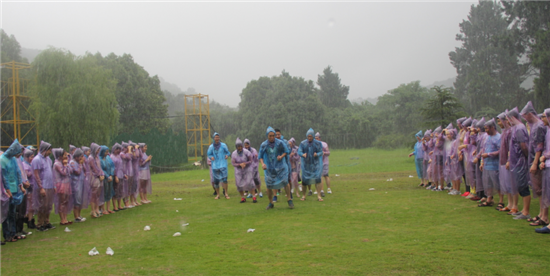 冒著大雨打水戰(zhàn),還是第一次這樣別致的體驗(yàn),反正是濕的,大家就豁出去了……可笑的是,開(kāi)戰(zhàn)沒(méi)幾分鐘,我們自認(rèn)為“高大上”的炮臺(tái)居然被敵軍一個(gè)水球無(wú)意間擊垮,就這么沒(méi)有預(yù)兆地瞬間擊垮了。大家一邊驚愕著,一邊笑得差點(diǎn)直不起腰。不過(guò)沒(méi)事,我們勇敢的戰(zhàn)士們是擊而不垮的,馬上撿起水球,賣(mài)力地向敵軍戰(zhàn)地?cái)S去。敵軍見(jiàn)狀,也不甘示弱,紛紛效仿。瞬間,密密麻麻的水球在大雨里穿梭飛來(lái)飛去,戰(zhàn)斗煞是激烈!