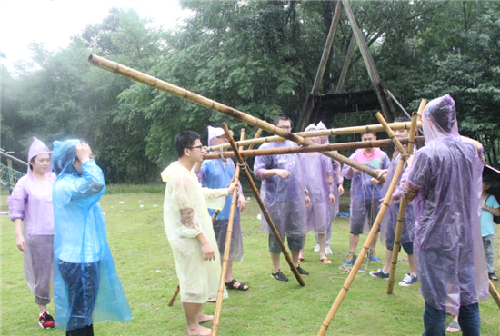 第二個(gè)團(tuán)體游戲是搭過(guò)山車(chē)。過(guò)山車(chē)的軌道是簡(jiǎn)易的PVC管搭建而成,管跟管之間用繩子,膠帶互相纏繞加固。在宏大橋梁工程面前,這些剛剛球場(chǎng)里揮汗如雨,大雨里大戰(zhàn)水球的男士們突然變成了“老練”的建筑家。在搭建的時(shí)候,他們給與了很多建設(shè)性意見(jiàn)。