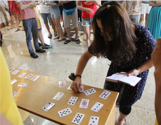 換了干凈的衣服,喝了姜茶,雖然歷經(jīng)大雨洗禮,下午場(chǎng)又滿(mǎn)血復(fù)活。由于天氣原因,下午場(chǎng)改為室內(nèi)活動(dòng)。第一個(gè)游戲就是考驗(yàn)智慧和團(tuán)隊(duì)配合的游戲---達(dá)芬奇密碼。幾張撲克牌隨機(jī)打亂,在桌子上背面排開(kāi)。每個(gè)隊(duì)伍依次出一人看一張牌,并且記住牌,最后有一個(gè)人需要按順序無(wú)差錯(cuò)的翻出所有的牌才算游戲完成,用時(shí)最短者獲勝。