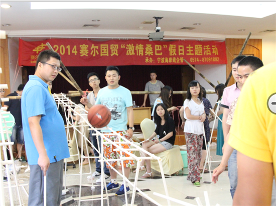 有的是不折不扣的實(shí)干家,蹲在地上認(rèn)真地鋸管子,搭管子,加固,女生們配合著綁著繩子,還有的擔(dān)當(dāng)宏觀大局的角色,幫忙看著整個(gè)構(gòu)架的高低,然后不停的喊著“高一點(diǎn),低一點(diǎn)”指揮著大家調(diào)整著高度,平衡度。分工有別,每個(gè)人在這個(gè)搭建的活動(dòng)里找到了自己的角色,然后盡自己的能力去配合,去完成。當(dāng)?shù)谝淮位@球從我們親手扎起來(lái)的天橋上順利滾過(guò)的時(shí)候,那種喜悅無(wú)以言語(yǔ)。