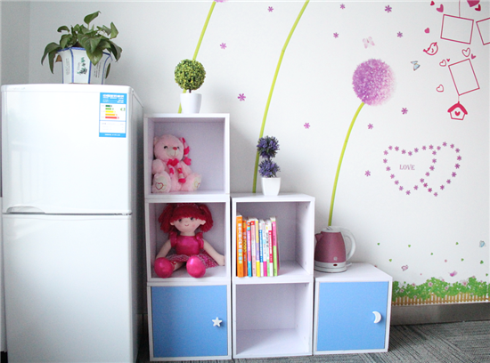 小清新書柜,配上紫色蒲公英墻貼,為整個母嬰室增色了不少,書柜中放置有精心挑選的哺乳知識用書,可供賽爾媽媽們閱讀,做到科學哺乳,哺育聰明寶寶。書柜中也可放置一些媽媽們的其他用品。