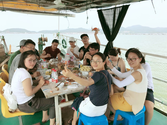 第二天一早,我們驅(qū)車來到了翡翠灣碼頭,開始了游船之旅。大家都很興奮地登上了船,看著船夫撒下漁網(wǎng),我們吹著海風(fēng),聽著徐哥的介紹,感覺十分愜意。搖搖晃晃一段時(shí)間后,船夫拉起漁網(wǎng),我們看到了各種海鮮,梭子蟹,青蟹,蝦,魚等,美味的午餐有戲咯。大家都很享受同事之間的談笑風(fēng)生,閑聊嬉戲的氛圍。結(jié)束了午餐后,我們踏上了回程,結(jié)束了這美好的周末。