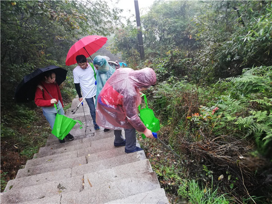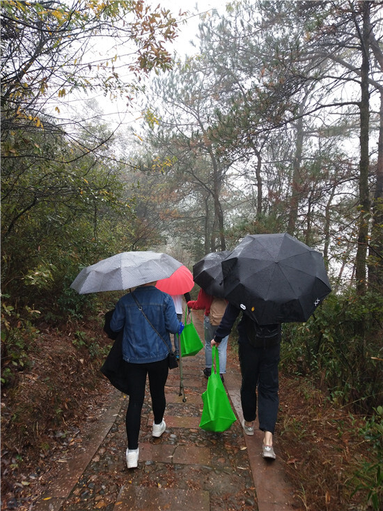 到達德勝巖山腳,新人們兩人一組自行組隊,領(lǐng)取了一些工具和物資后迅速出發(fā)。秋雨唰唰地下著,細密的雨絲在山路間織起了一張灰蒙蒙的幔帳。我們或披著雨衣或撐著雨傘,小心翼翼地走在德勝巖的山路上,雖然路途艱辛,但所有小伙伴依舊神采奕奕,一路上有說有笑。新同事們一人撿拾垃圾,一人撐著環(huán)保袋,配合相當(dāng)默契。