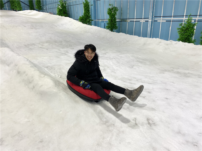 我們早早地驅(qū)車前往團(tuán)建的第一站——愛上義烏的夜??紤]到大家的參與性,我們一致選擇滑雪項(xiàng)目。每個(gè)人都興沖沖地牽著“座駕”走上滑雪道的起點(diǎn),伴隨著興奮又害怕的尖叫聲沖下滑道。除了滑雪之外,當(dāng)然還得打一場雪仗才不虛此行。