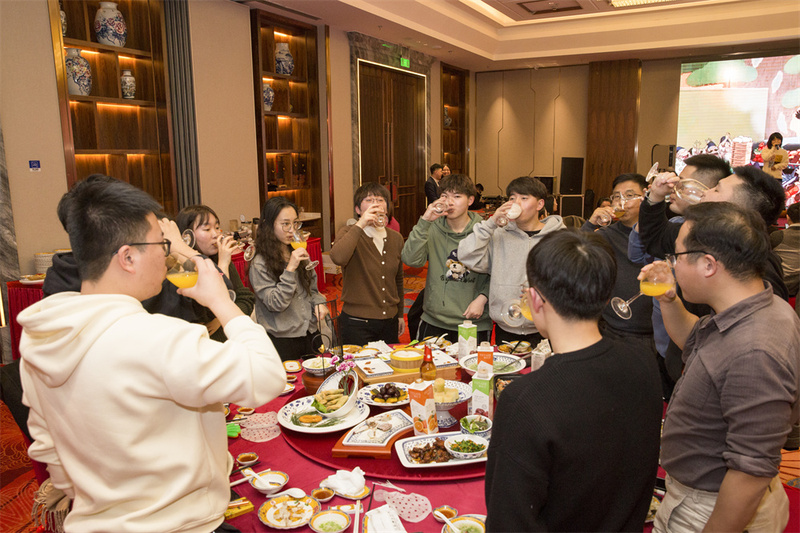 夜幕降臨,寧波綠時同事集聚狀元樓,通過視頻方式與義烏同事們共同享受一場視聽盛宴。晚會以謝總簡短卻有力的致辭拉開序幕,歌曲、舞蹈等精彩節目應有盡有。此外,8輪抽獎環節,從家用電器到現金大紅包,獎品拿到手軟,現場氛圍激動熱烈。游戲環節稱為一絕,以“桌”為單位進行游戲,最快速度完成團隊目標的獲勝,并且有大紅包獎勵,豐富的游戲引得全場哄堂大笑。晚會最后,由領導們領唱,全體綠時同事合唱《明天會更好》,表達對綠時未來的美好期望。