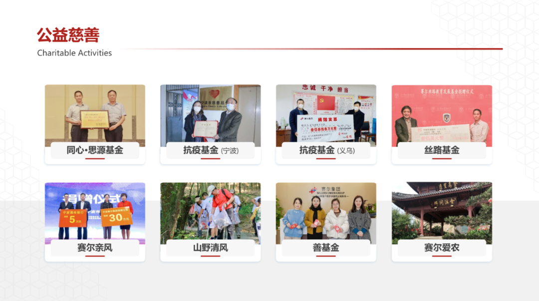 持續推進企業高質量發展,量力而行地投身社會公益事業,始終是賽爾集團企業文化的不變堅持。賽爾集團成立25年以來,已累計捐贈現金超過3000萬元,涉及扶貧濟困、助學支教、新農村建設、社會公益服務等領域,搭建了“山野清風”環境保護、“賽爾親風”關愛失獨老人和星寶自閉癥家庭、“絲路基金”國際文化交流、“賽爾愛農”支持新農村建設等內容為主體的企業公益慈善體系。