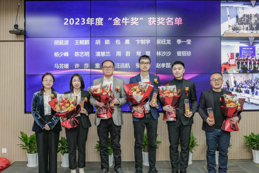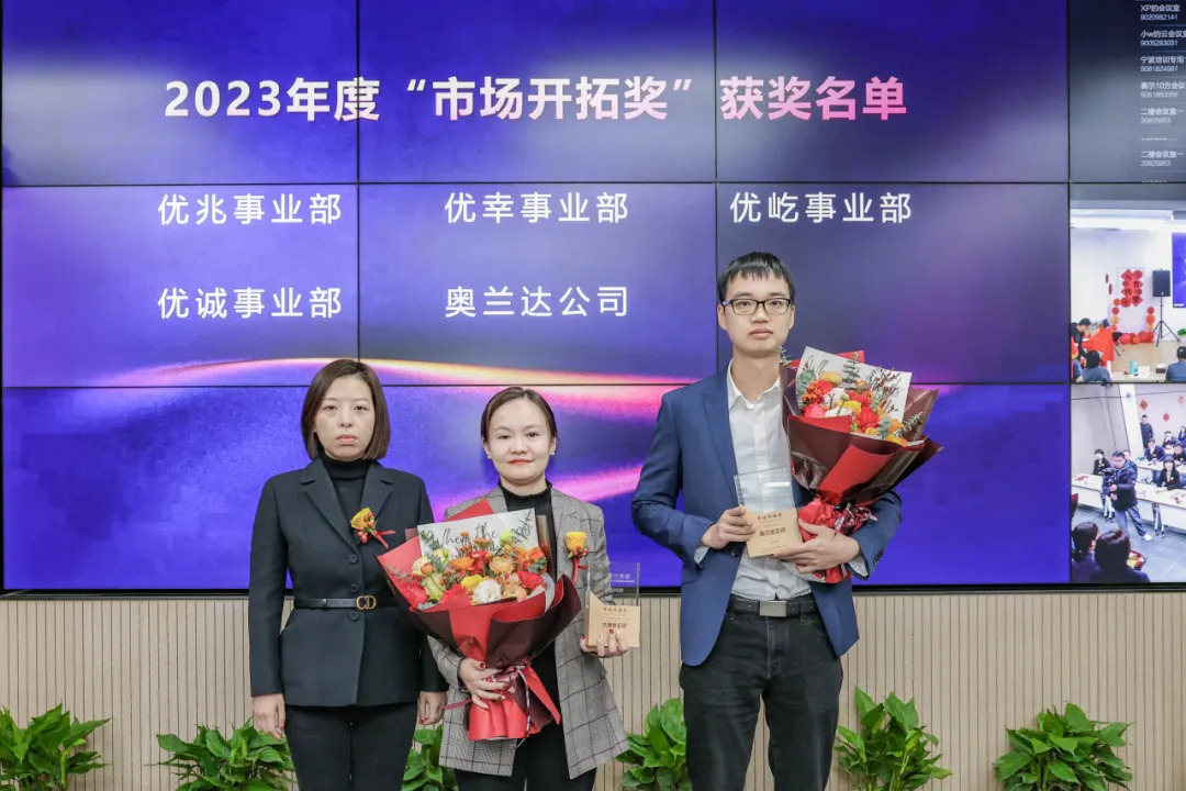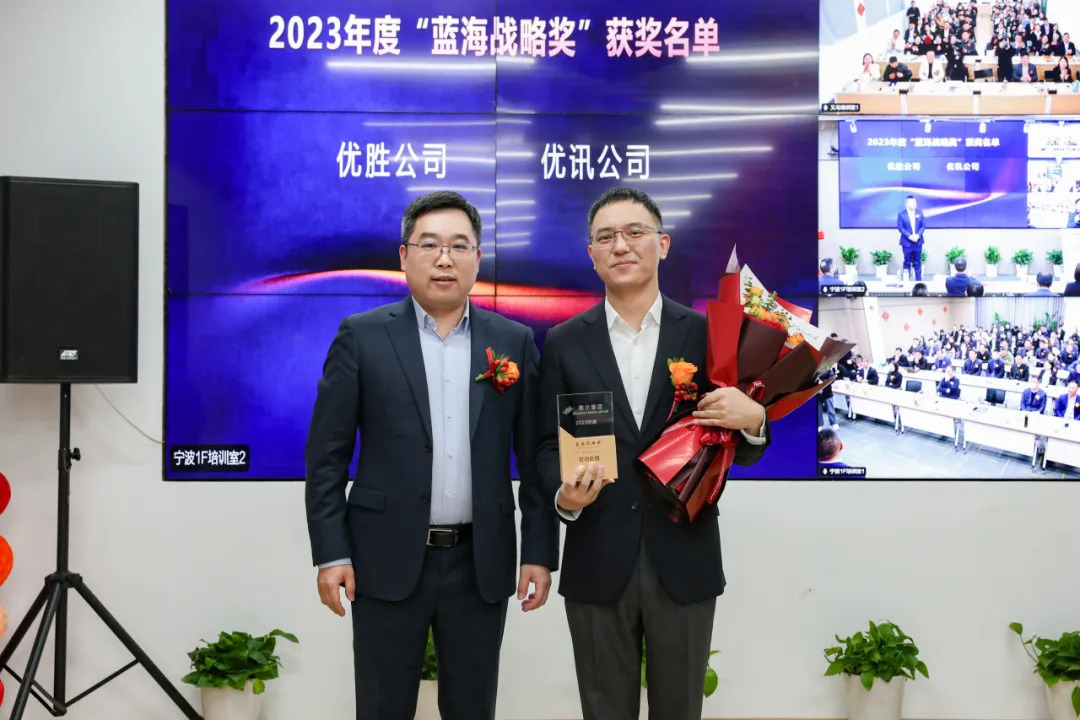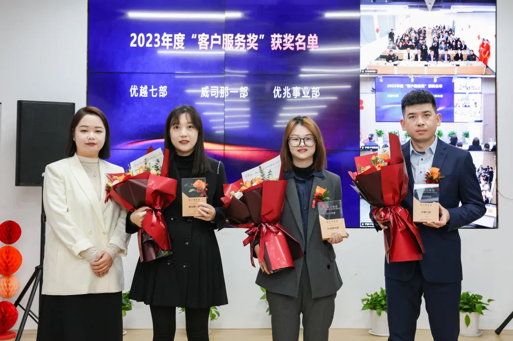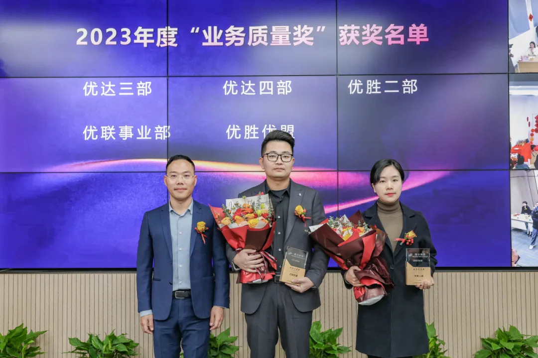 會議舉行年度重要獎項頒獎儀式。23年度集團設立集體獎項7個,優景公司榮獲文化建設獎和學習組織獎,優騰公司榮獲協同共享獎和清廉建設獎,優越公司榮獲創新活力獎,優遠公司榮獲人才磁石獎,集團單證風控部榮獲信息安全獎。23年集團設立團隊獎項6個,分別是藍海戰略獎、市場開拓獎、業績倍增獎、業務質量獎、網絡營銷獎和客戶服務獎,共有21個業務團隊獲得獎項榮譽。藍海戰略獎由優勝公司和優訊公司獲得,該獎項要求對新業態模式敏感,業務布局前瞻性強,有示范性新項目落地成功,公司業務布局成為集團重要業務賽道之一,陳勇珍和錢天鋒分別代表各自公司領取藍海戰略獎,所獲榮譽實至名歸。23年度陳勇珍、錢天鋒、王建、徐生科等四位業務總經理獲得個人獎項的最高榮譽金鼎獎,該獎項歷來以競爭激烈著稱,四位獲獎者憑借著業務規模、高速增長和盈利能力摘得金鼎桂冠。2023年度共有20位業務負責人憑借部門優秀業績,榮獲個人金牛獎項并現場上臺領獎。